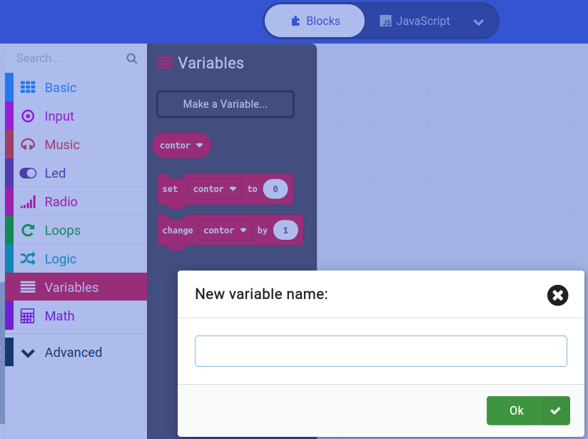 Crearea unei variabile presupune să dăm un nume variabilei; vom alege un nume scurt, dar sugestiv. Vom da click pe butonul Make a Variable… .
