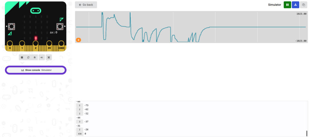 Mișcăm micro:bit-ul stânga-dreapta și sus-jos cu ajutorul mouse-ului și urmărim graficul.