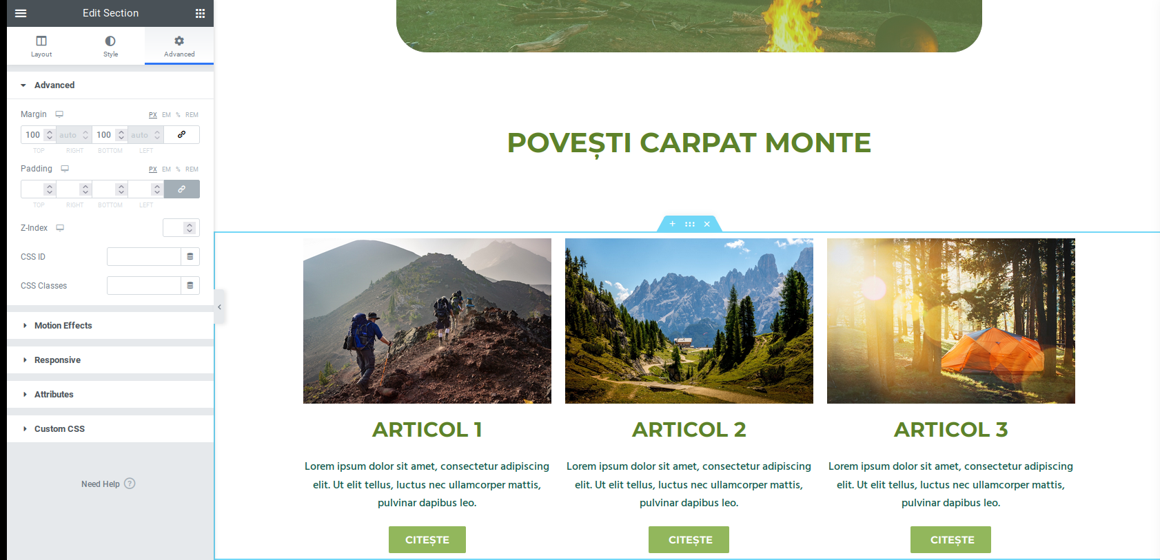 Schimbăm pozele și modificăm titlul text. Adăugăm în setările secțiunii o margin top și margin bottom de 100 px pentru a obține spațiul necesar față de secțiunea titlu.