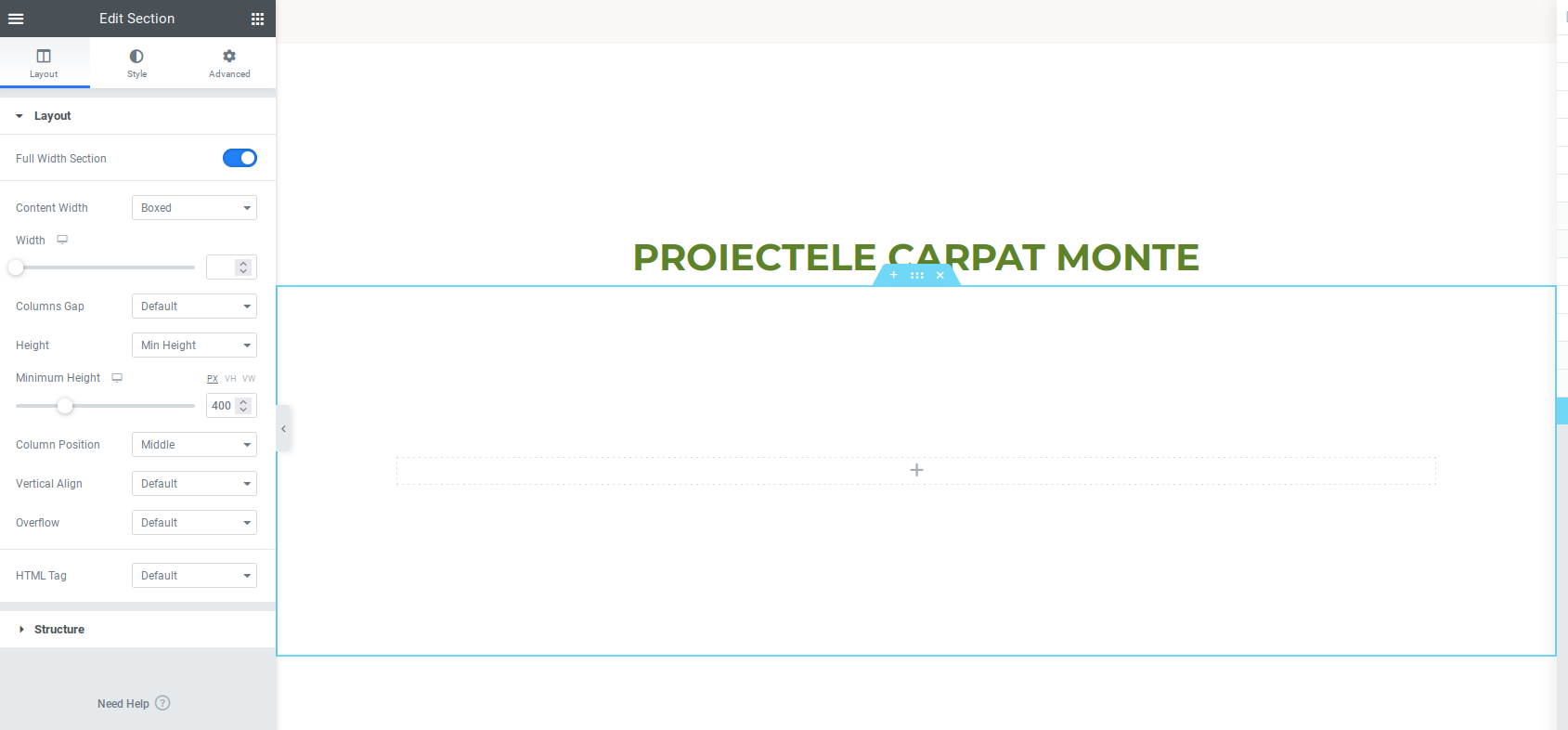 Pentru ultimele ajustări vom merge la setările secțiunii și vom dezactiva Min Height și vom stabili o valoare Width de 850 px.