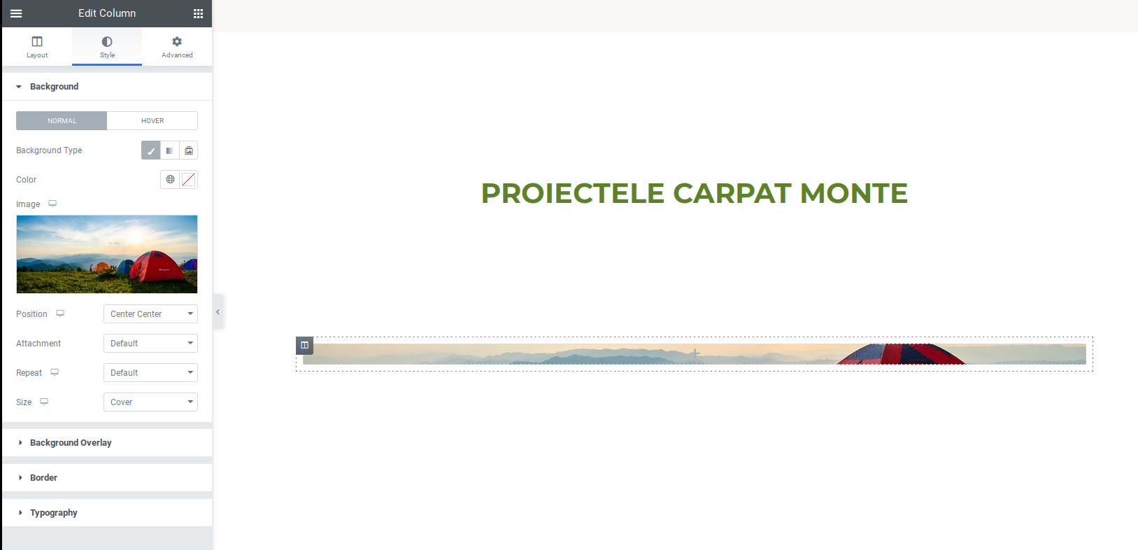 Pentru imagine alegem Size – Cover, Position – Center Center.Aplicăm și un Background Overlay folosind culoarea predefinită de Accent din setările globale ale Elementor.